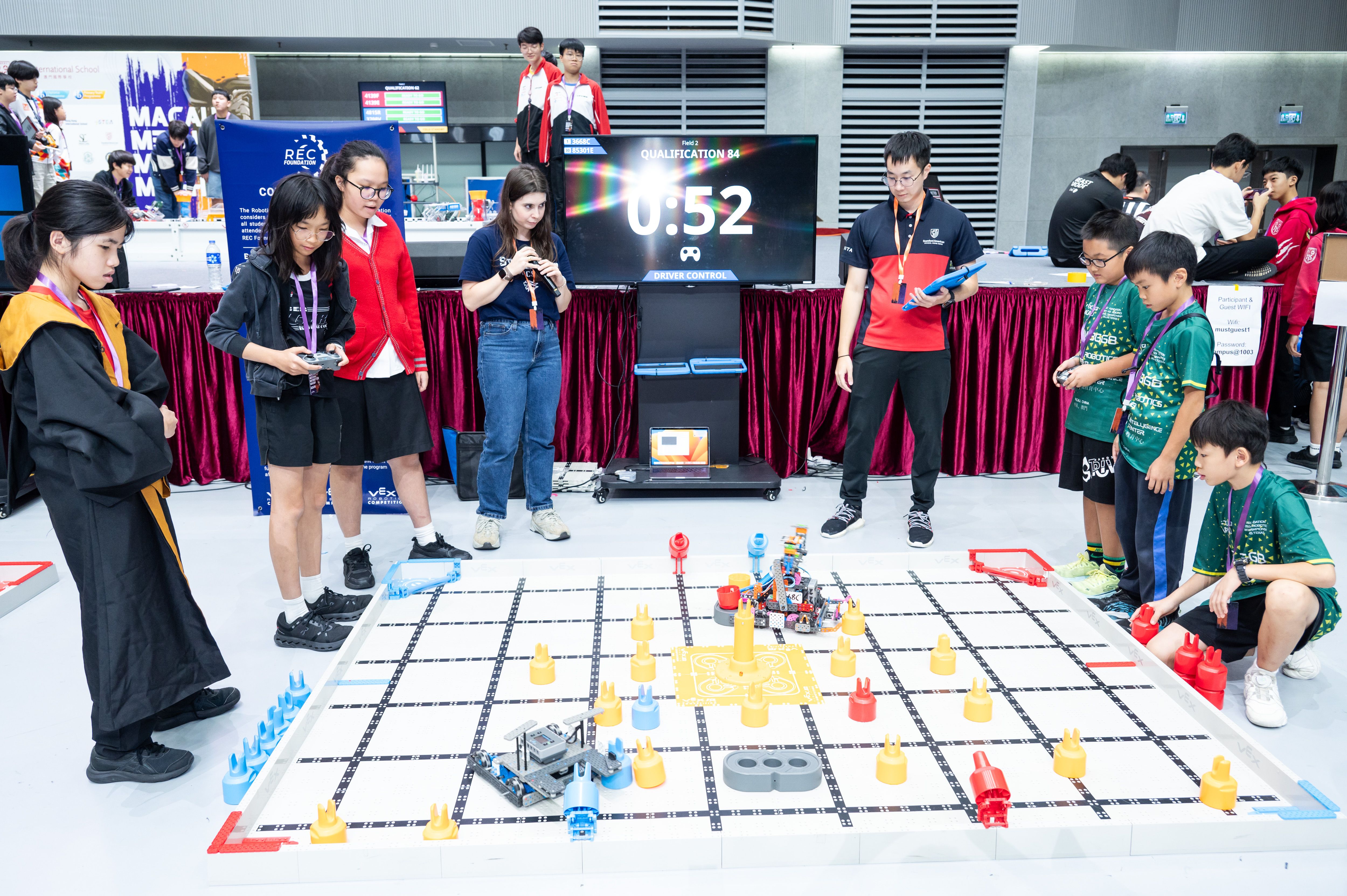 Notable guests included guest speaker Dr. Sun Qiao, Vice Dean of Innovation and Engineering at Macau University of Science and Technology (MUST). Dr. Sun inspired attendees with insights on the future of robotics in Asia, emphasizing the role of education in driving technological advancement. Overseeing the competitions as head judge was Mr. Ko Wong, a seasoned robotics expert with five years of experience at the VEX World Championships. His expertise ensured a rigorous and fair evaluation process, upholding the highest standards of competition.